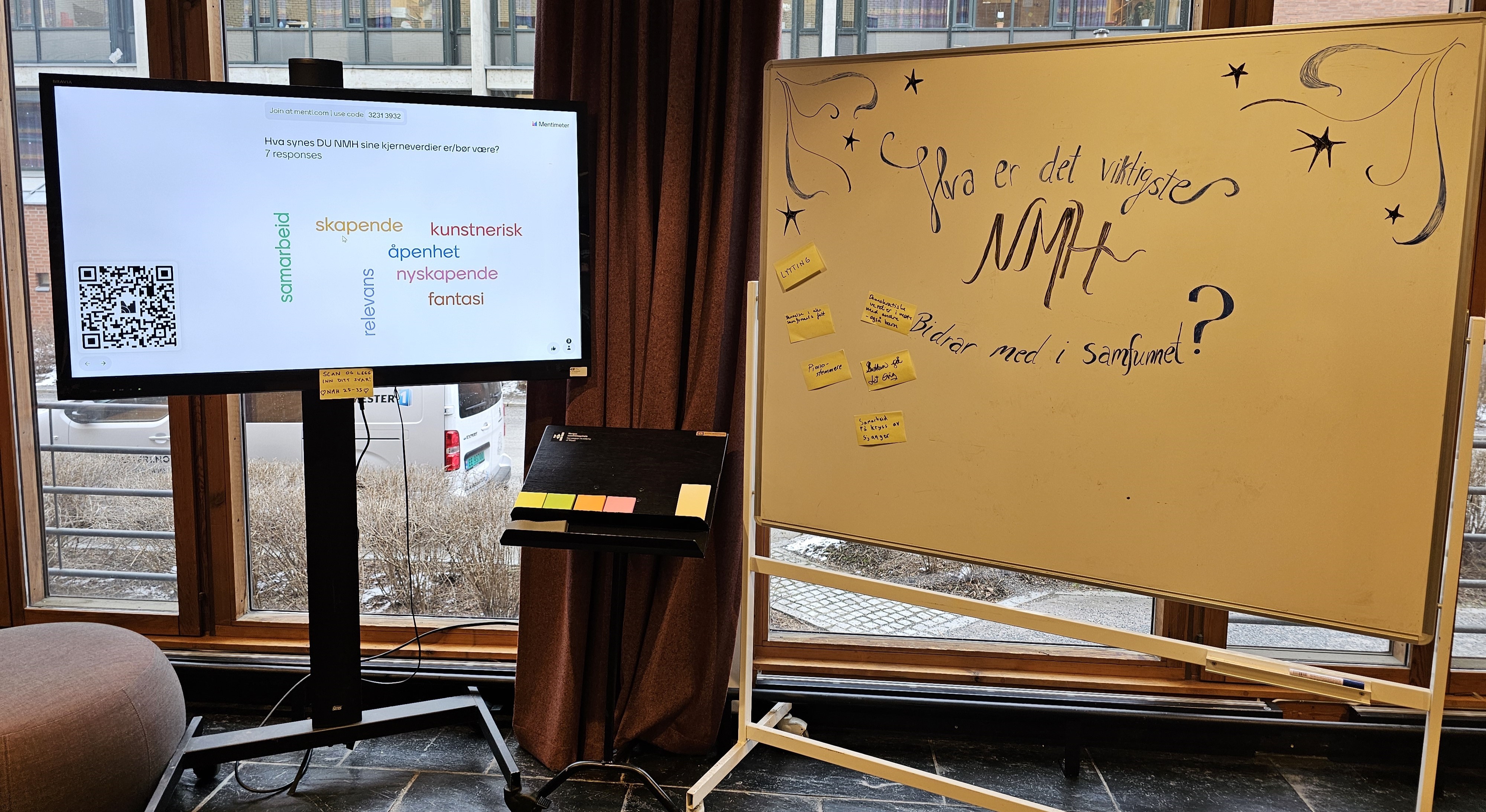 You can answer digitally via Menti, or with post-it notes and markers. Write what you think is most important for NMH to include in the strategy work going forward! Read more about the strategy process elsewhere on this page.